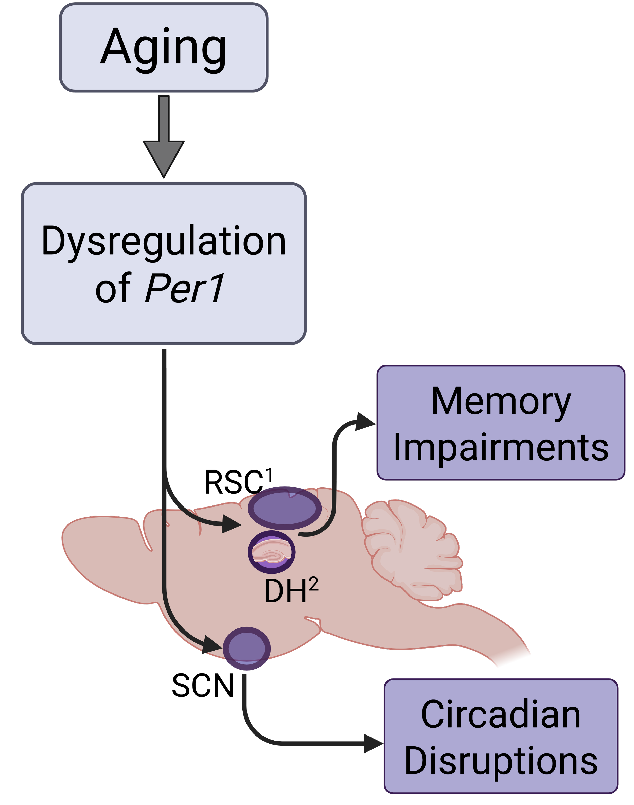 We have discovered a novel mechanism that may serve as a key interface between the circadian system and long-term memory formation: the clock gene Period1 (Per1). Our work has shown that Per1 functions in the dorsal hippocampus to modulate spatial memory consolidation in addition to its well-documented role in the brain’s central pacemaker, the suprachiasmatic nucleus. Per1 is also repressed in the dorsal hippocampus and retrosplenial cortex in old mice that have spatial memory impairments and upregulating Per1 within either of these brain regions can ameliorate age-related impairments in memory . Together, this work suggests that Per1 ‘moonlights’ in memory-relevant brain regions to exert diurnal control over memory and age-related alterations in Per1 in these regions may contribute to age-related memory decline.