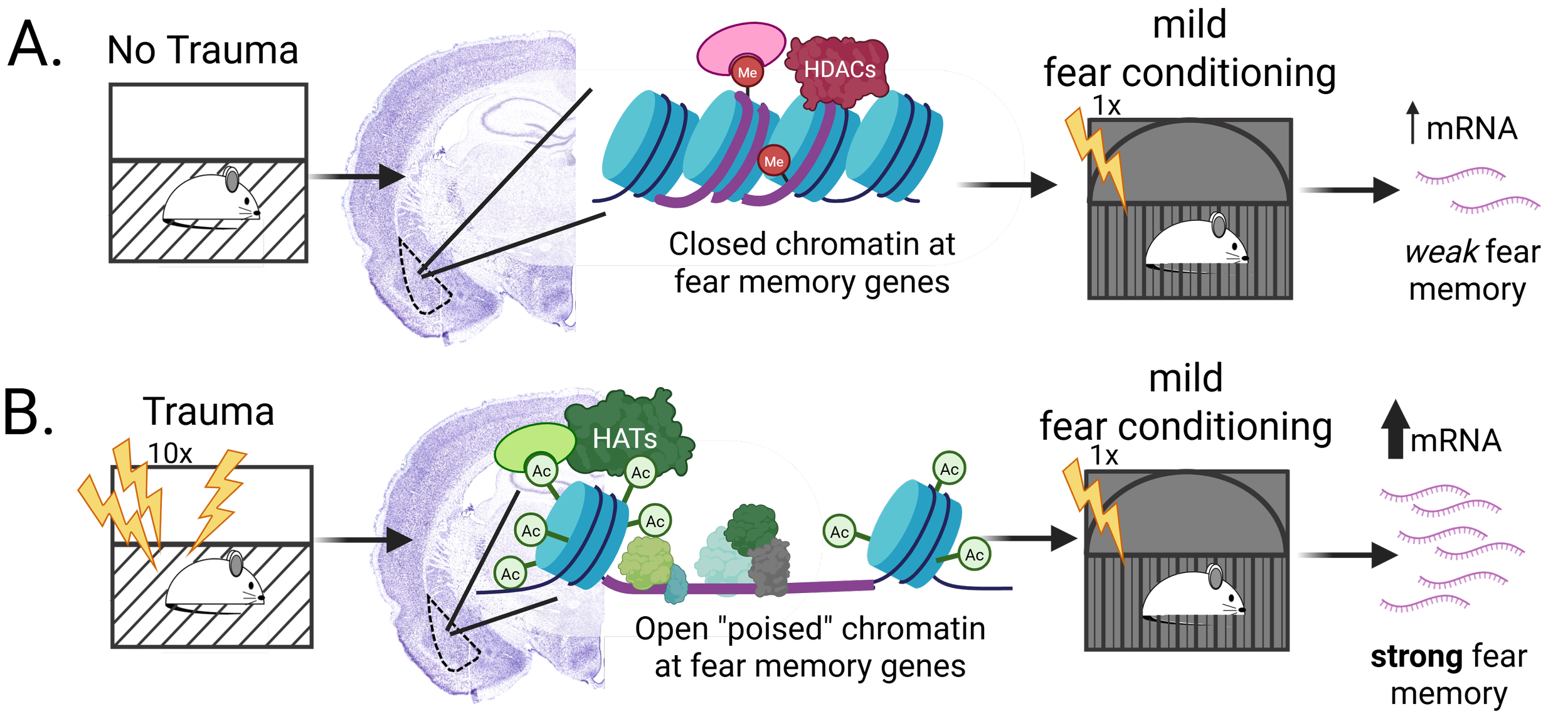Proposed mechanism underlying the SEFL paradigm. A) In the absence of the trauma event, HDAC3 maintains a restrictive chromatin state in the basolateral amygdala, minimizing mRNA expression during subsequent fear conditioning and forming a very weak fear memory. B) Following the trauma event, HDAC3 is kicked off of the chromatin in the basolateral amygdala, permitting extensive acetylation and an open chromatin state that allows for substantial mRNA expression during subsequent fear conditioning and the formation of a strong fear memory.